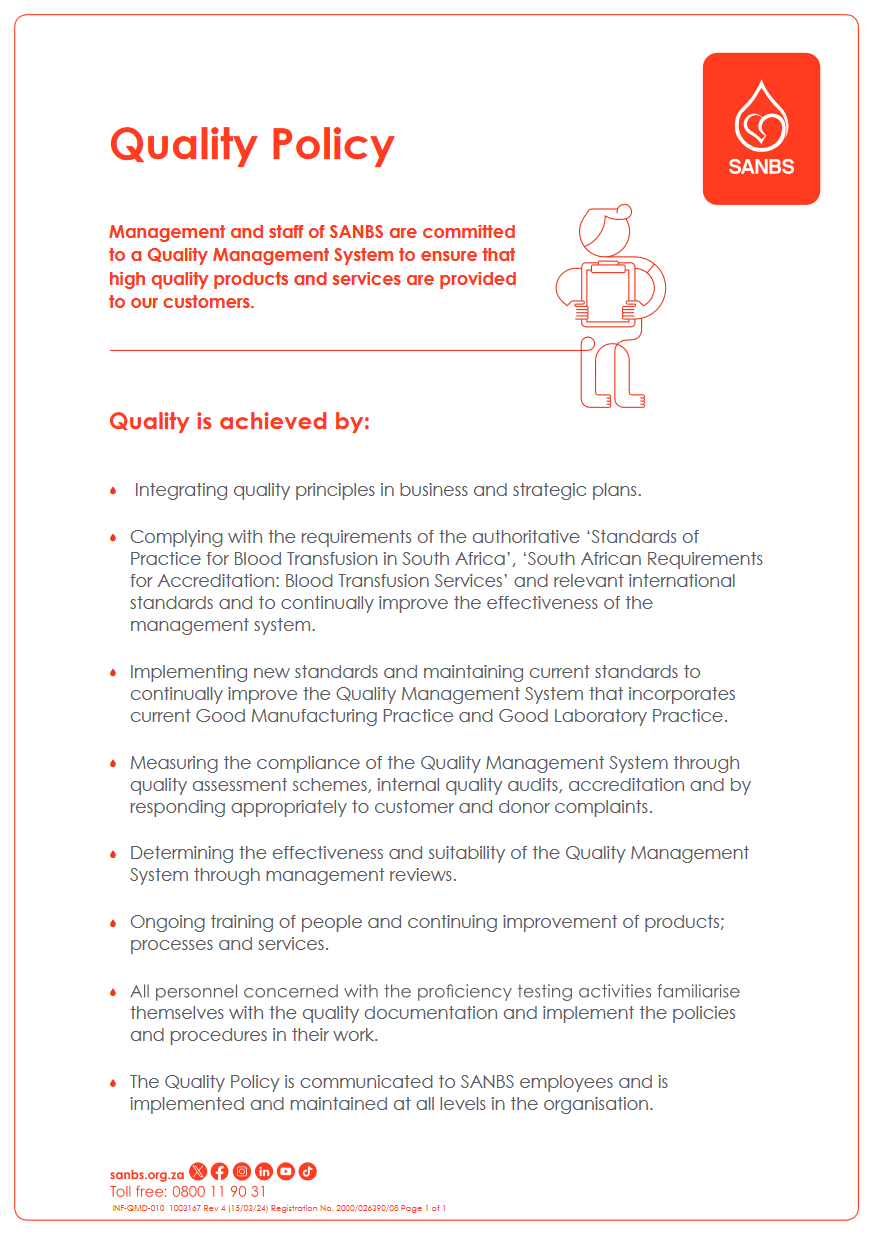 Management and staff of SANBS are committed to a Quality Management System to ensure that high quality and services are provided to our customers.